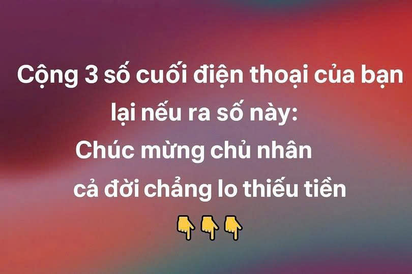 Nếu số điện thoại của bạn có 3 số cuối là 789: Khi cộng lại sẽ là 7+8+9=24=2+4=6. Nếu ra con số 6 thì đó là số điện thoại may mắn.