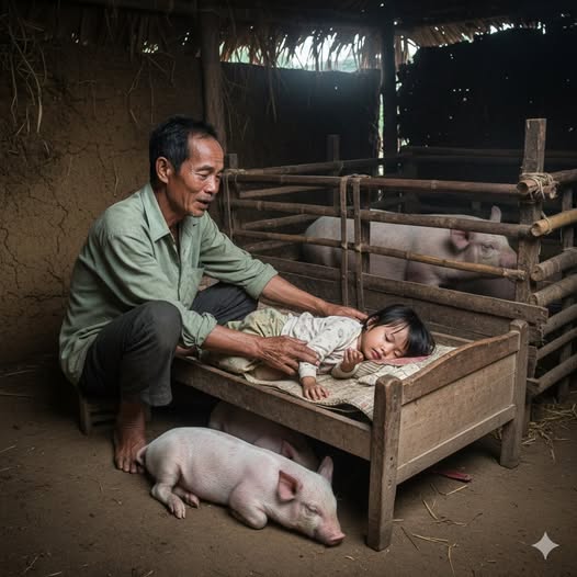 Trên một tấm giường xếp cũ, không màn, không chiếu — bé Vy đang co ro quấn tấm chăn mỏng như khăn giấy, ngay bên cạnh bức tường chuồng lợn còn lấm bùn.